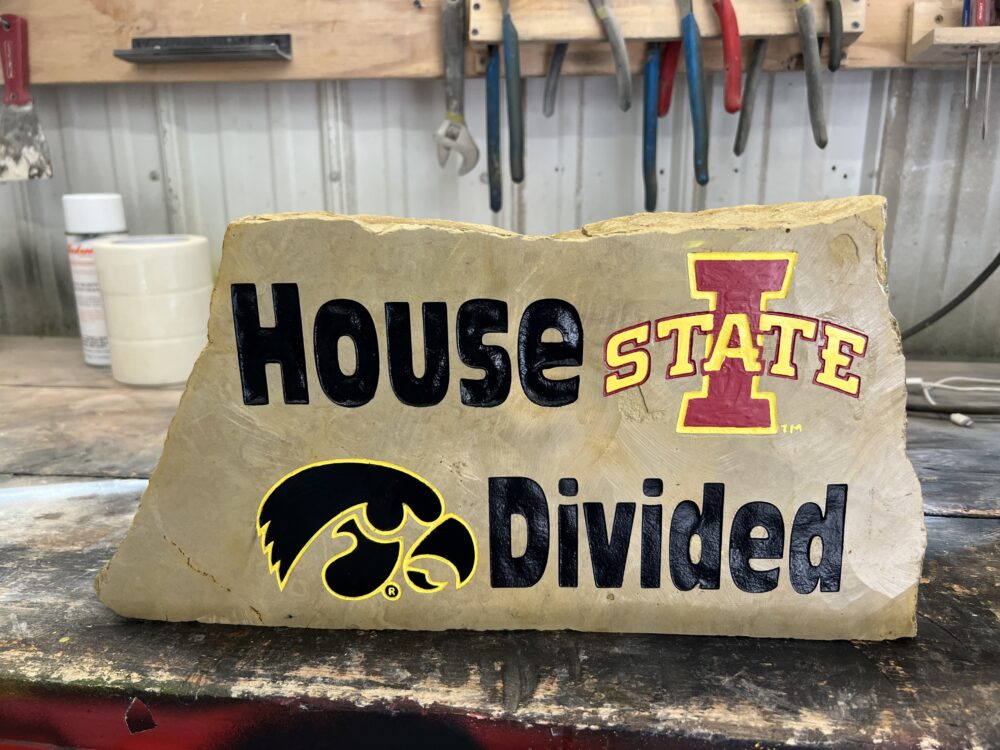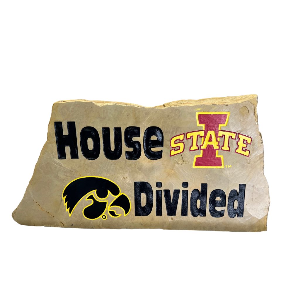 If you’re looking for a great way to decorate for a house divided, this engraved rock is perfect! We hand select our stones from our quarries in north Iowa, engrave House Divided and the Iowa State and Hawkeyes logos on it, paint it and seal it for proper indoor or outdoor display. We are officially licensed to sell Iowa State and University of Iowa products.
