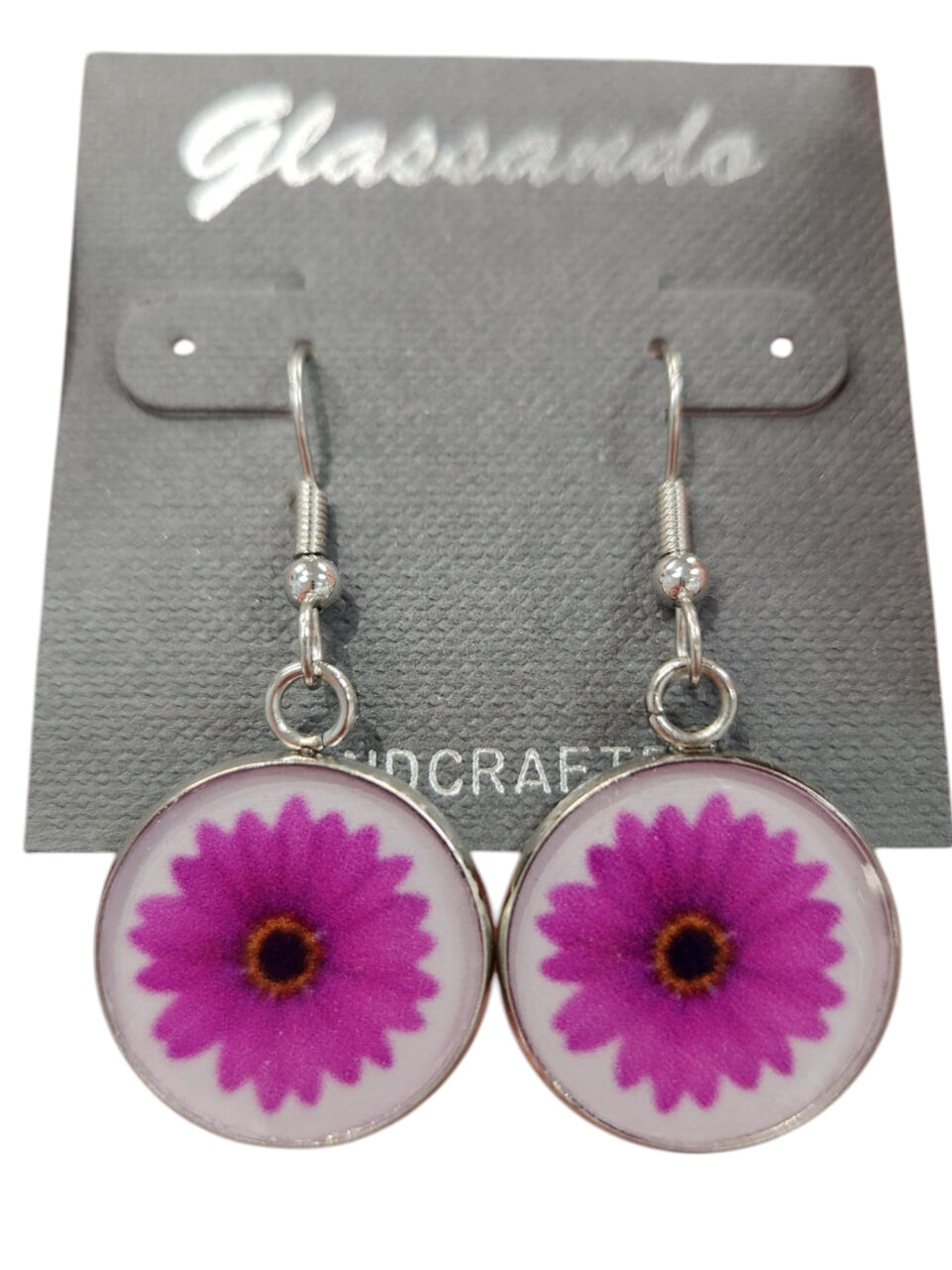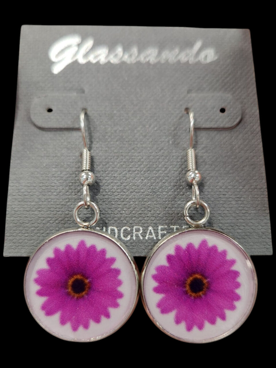 These flower earrings feature an image of a daisy sealed in resin, inside a stainless steel setting. The hook style ear-wire is also stainless steel. The stainless steel used in these earrings is hypo-allergenic and will not tarnish. These earrings are also light-weight.